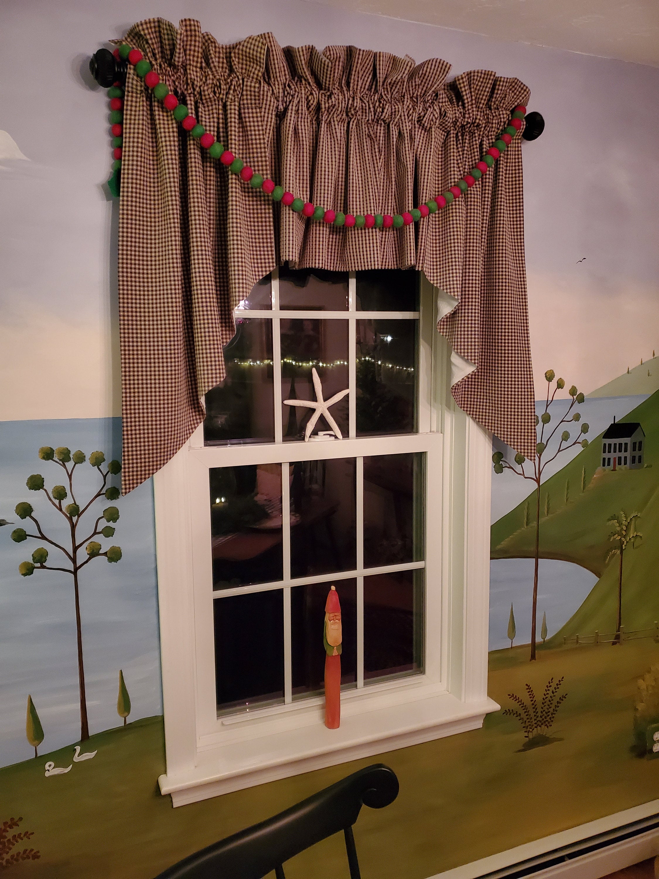 Has a hemp loop for hanging. 2 cm wool felt balls. 55" long with one holly leaf.